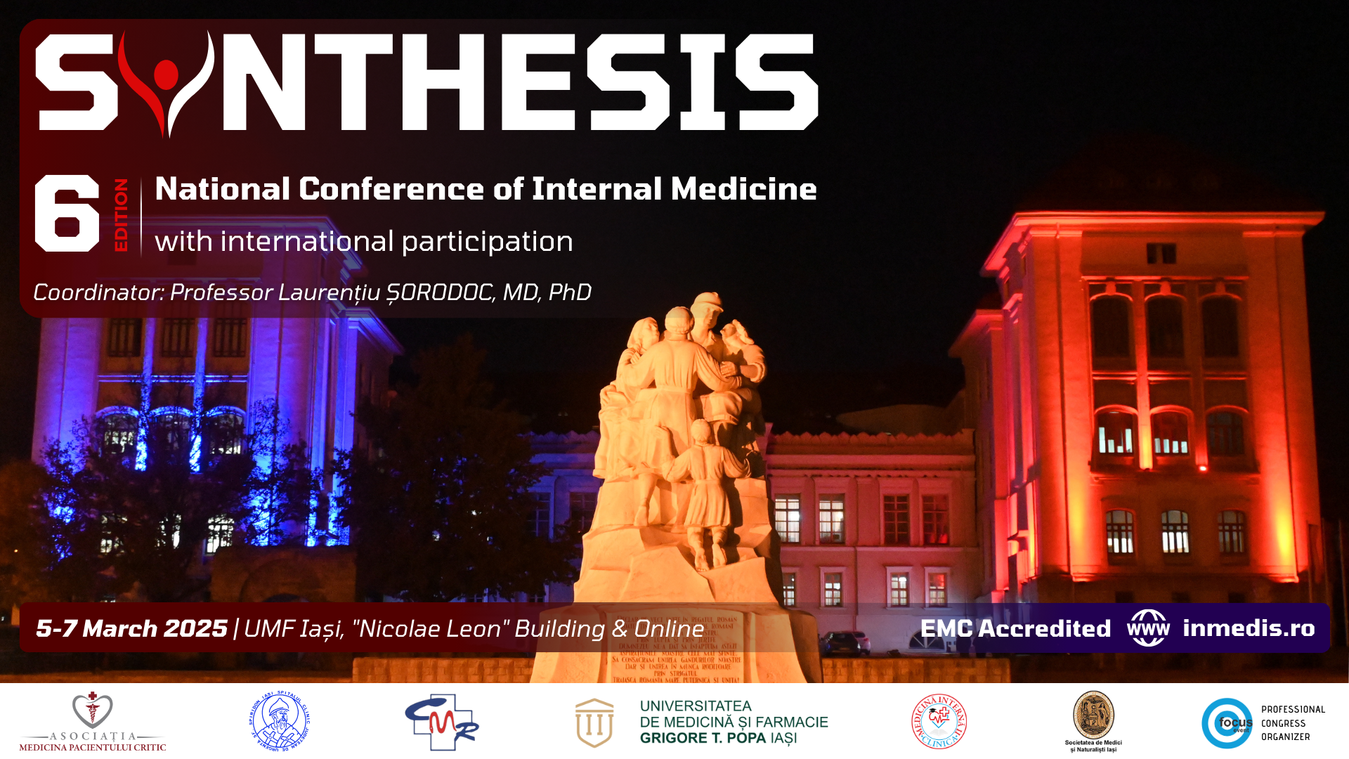 I have the special pleasure to invite you to the sixth edition of the "SYNTHESIS" National Internal Medicine Conference, which will take place in Iași, between March 5-7, 2025. The scientific works will take place in physical format at the University of Medicine and Pharmacy "Grigore T. Popa" Iași, but will also benefit from online transmission.